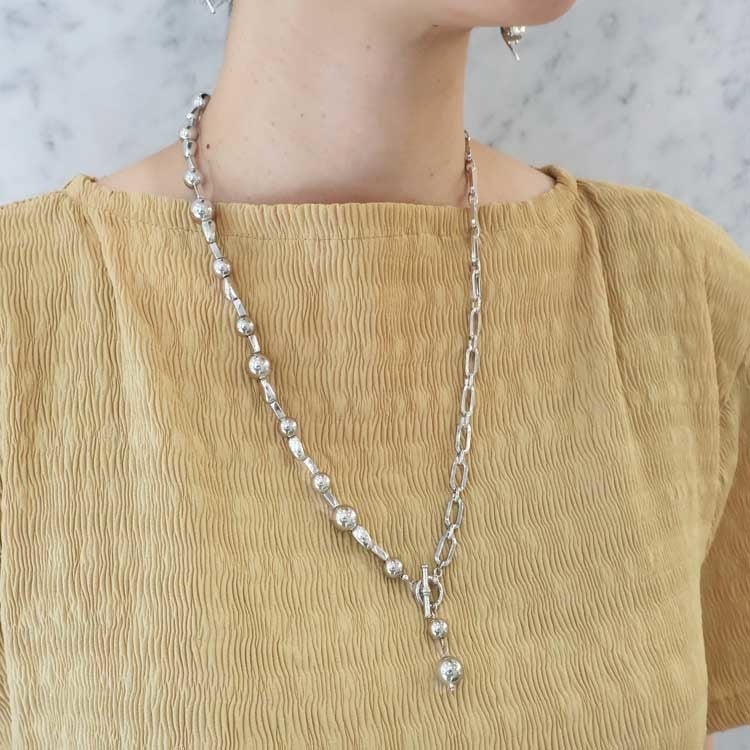 - 重量感あるデザインと軽やかな着け心地が特徴のメタルビーズ