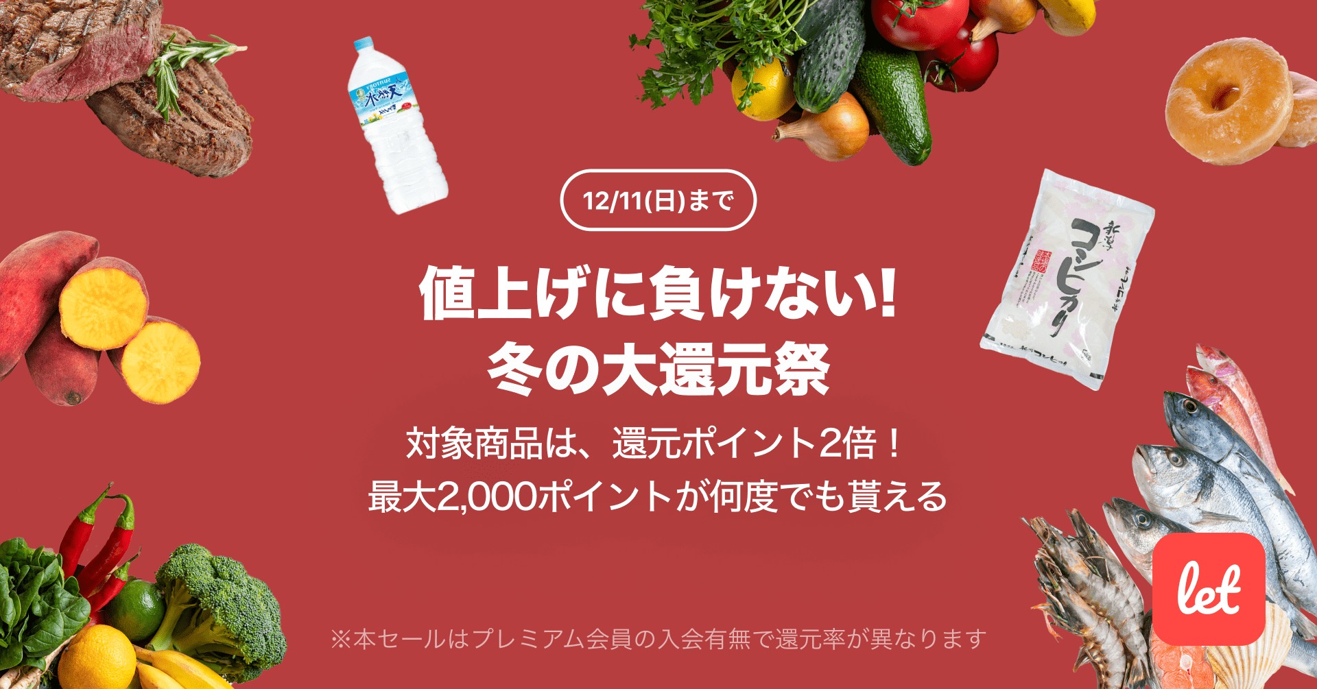 株式会社レット(本社:東京都港区、代表:佐藤 航陽)が運営する、食品ロス/在庫ロス削減のマーケット「Let(レット)」内で「値上げに負けない!冬の大還元祭」を12月9日(金) 18:00より開催します。期間中、プレミアム会員様限定で対象の食品をご購入いただくと、2,000ポイントを上限に還元ポイントが2倍になります。期間中のご購入であれば、ポイント還元はお一人様あたり何度でもご利用いただけます。