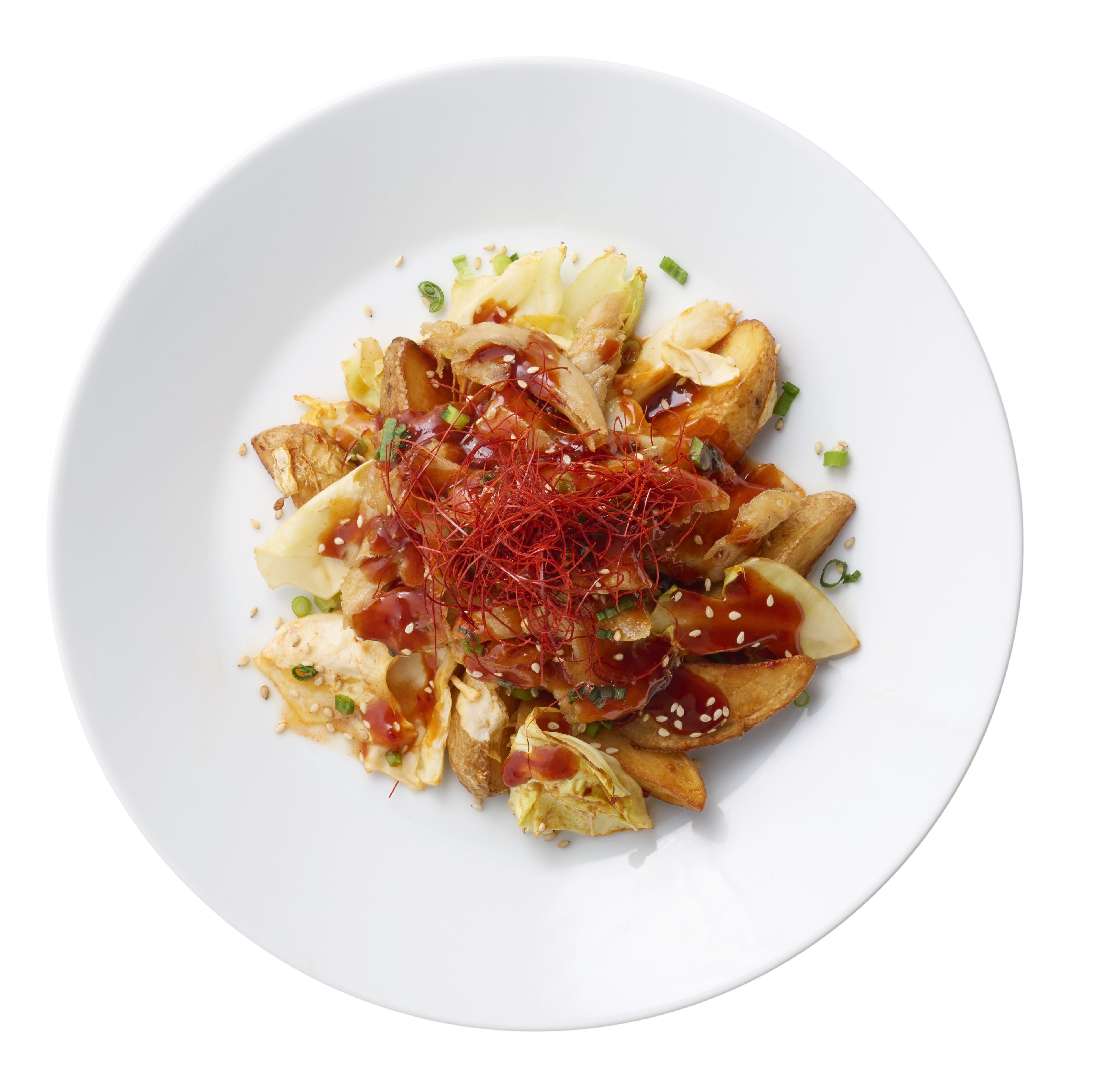 植物由来のチキンを軽く揚げ、旨辛ソースをかけたタッカルビ。ニンニクを効かせたスタミナ満点料理。ライスと合わせて召し上がりください。