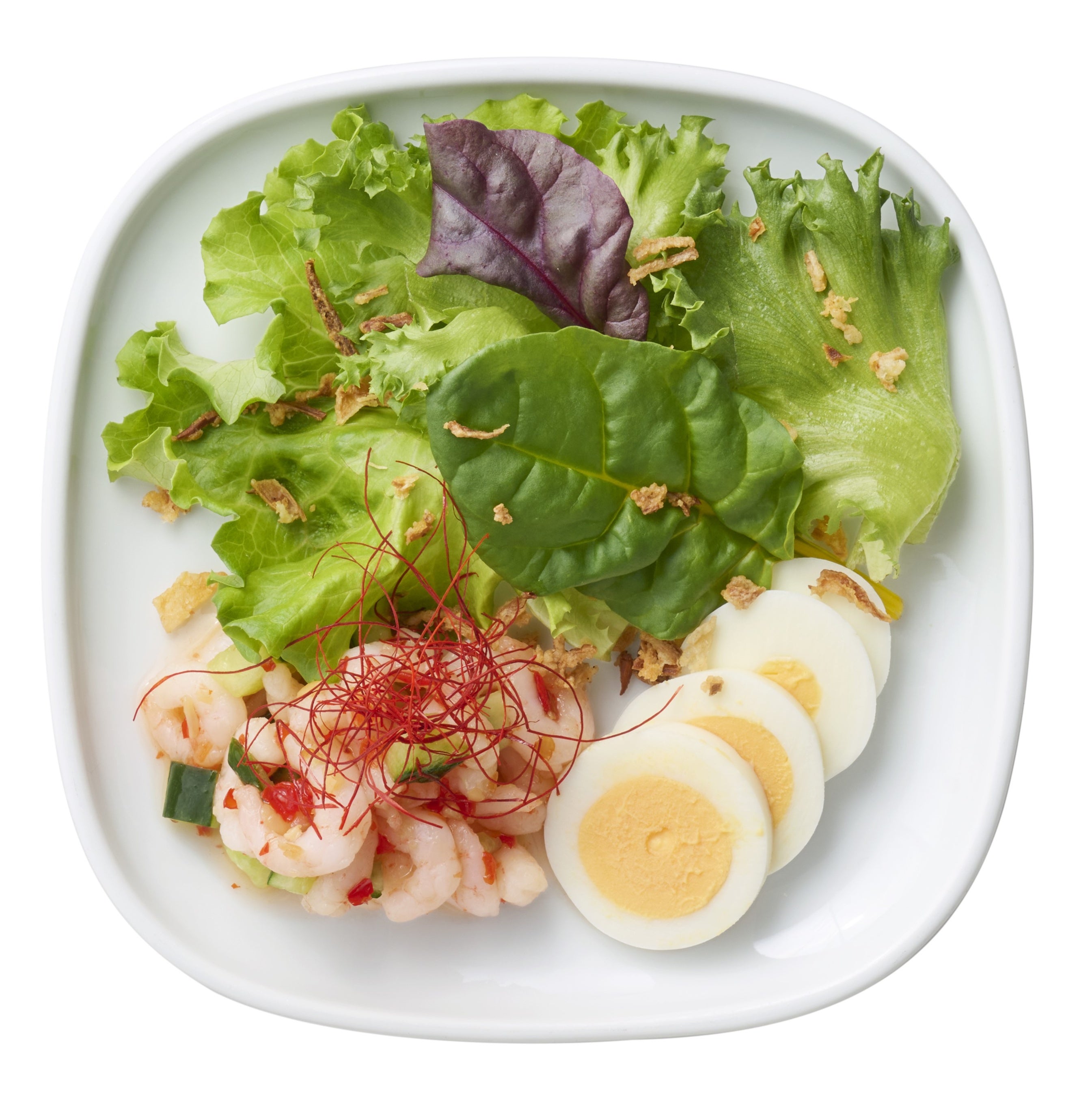 MSC認証のエビと、平飼いのゆで卵にピリ辛ドレッシングをかけました。カリカリのフライドオニオンと一緒にお召し上がりください。