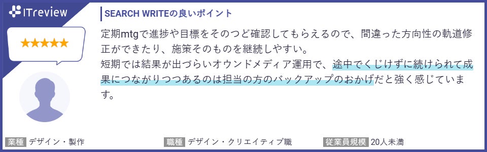 SEARCH WRITEは、2024年7月時点で214件のレビューをいただいており、平均顧客満足度4.5を獲得しています。特に「サポート品質」や「使いやすさ」「導入のしやすさ」といった項目において高い評価をいただいています。
