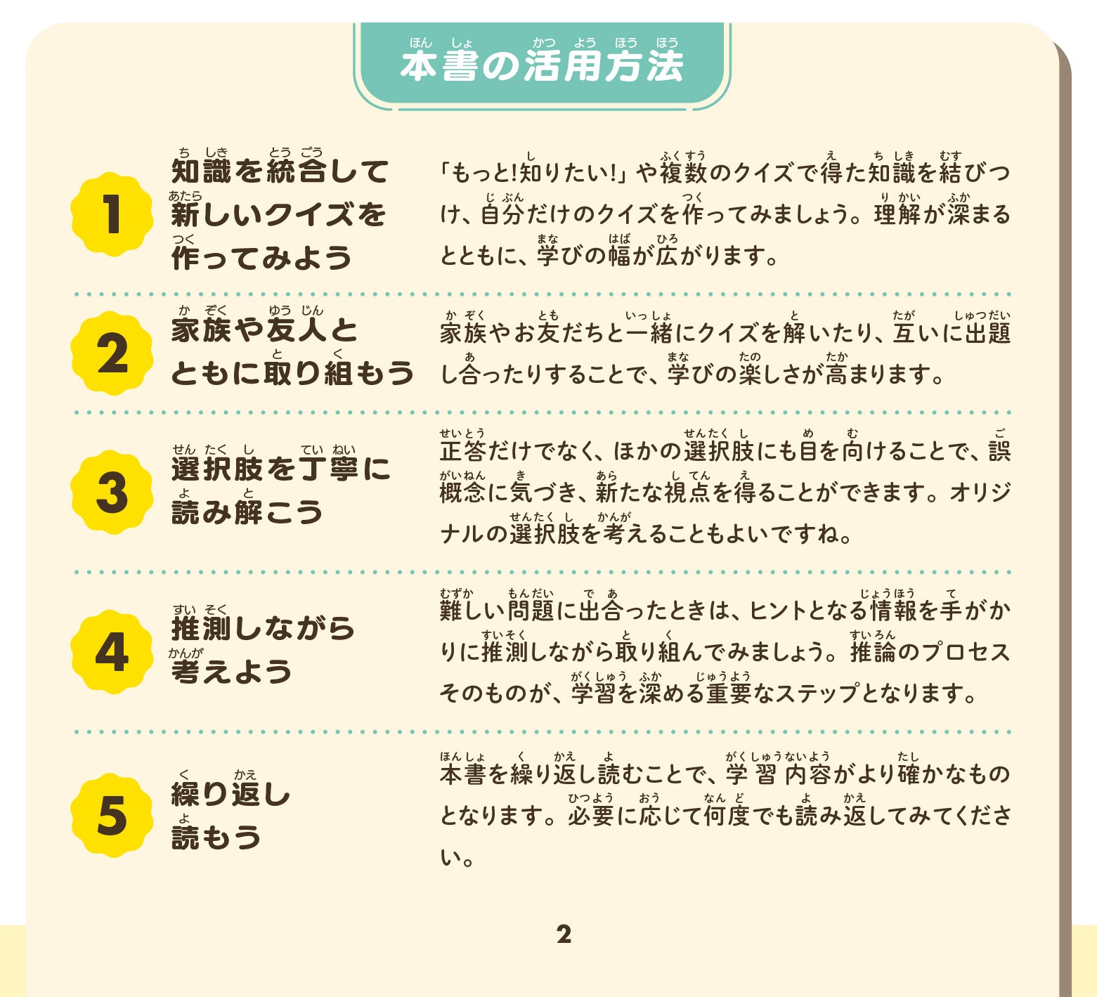 本書は、小学校3・4年生をメインターゲットとし、クイズで子どもの興味を引き出しながら知識を定着させ、さらに勉強への関心を高めていく本です。クイズを取り入れた学習活動は、子どものモチベーション向上や学習意欲の喚起を促進するだけでなく、知識の定着にも効果があることが多くの研究で示されています。