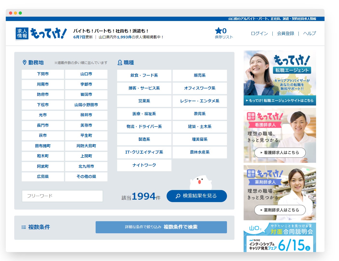 株式会社ビジネスアシストが運営するフリーペーパー連動の求人情報サイト「もってけ!」では、山口県を中心に 2,000 件以上の求人を取り扱っています。