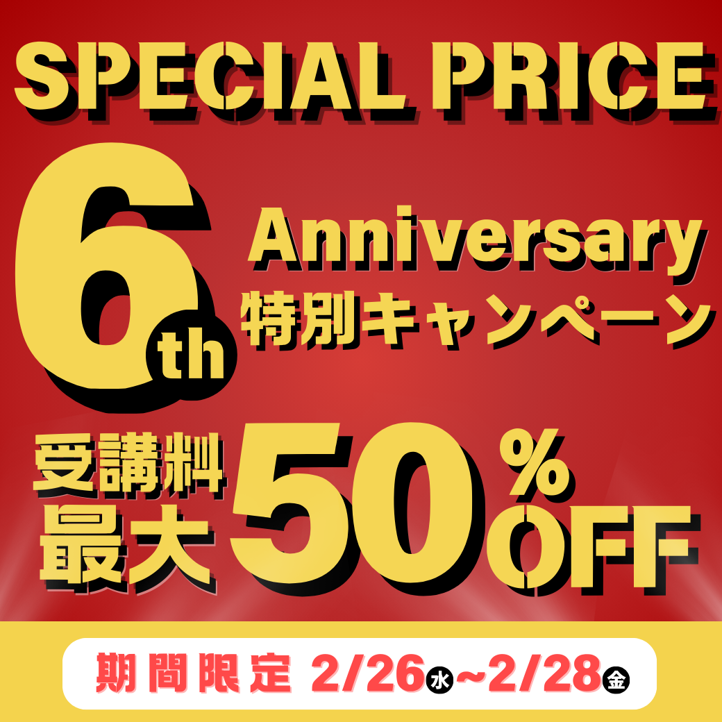 「NINJA CODE」は、2025年1月に開校6周年を迎え、2月より7年目に突入いたしました。これまでに多くの方にご受講いただき、たくさんの励みとなるお声を頂戴しております。日頃のご愛顧への感謝を込めて、より多くの方に学習の機会を提供できるよう、「6周年記念キャンペーン」を開催することに決定いたしました。