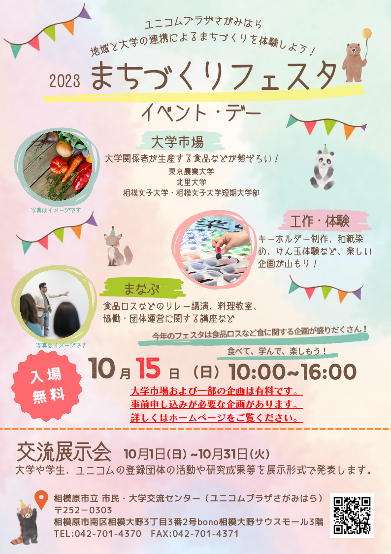 相模原市立市民・大学交流センター(ユニコムプラザさがみはら)では、大学や学生、NPO法人や地域活動団体による地域貢献活動や研究成果等を、市民や各関係者に発表し、相互に学べる機会として「まちづくりフェスタ」を開催しています。