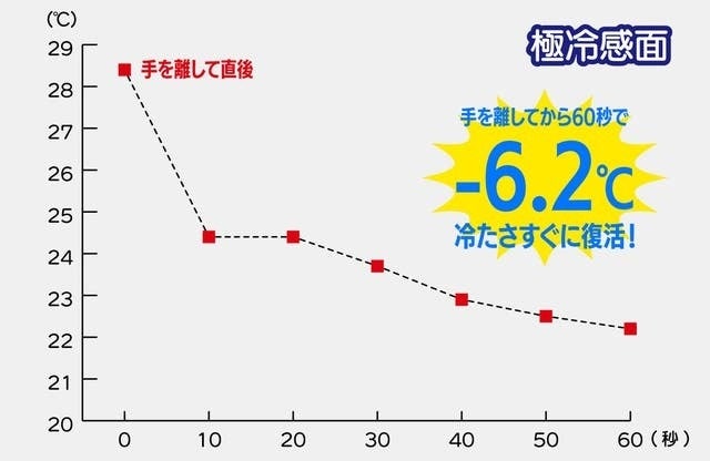極みクール面は、手を離してわずか60秒で、表面温度が28.4℃⇒22.2℃に冷えます。実に-6.2℃も冷たさが復活しました!