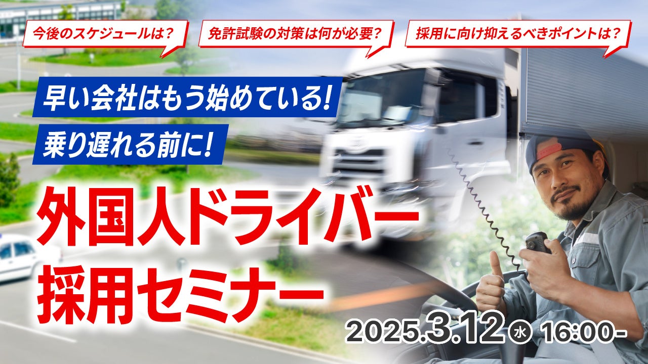 「働く」に関する社会課題をビジネスで解決するキャムコムグループの株式会社天職市場(本社:東京都新宿区、代表取締役:春名敬太 、以下:天職市場)は、2025年3月12日(水) 16:00よりオンラインセミナー『早い会社はもう始めている!乗り遅れる前に!「外国人ドライバー採用セミナー」』を開催いたします。
