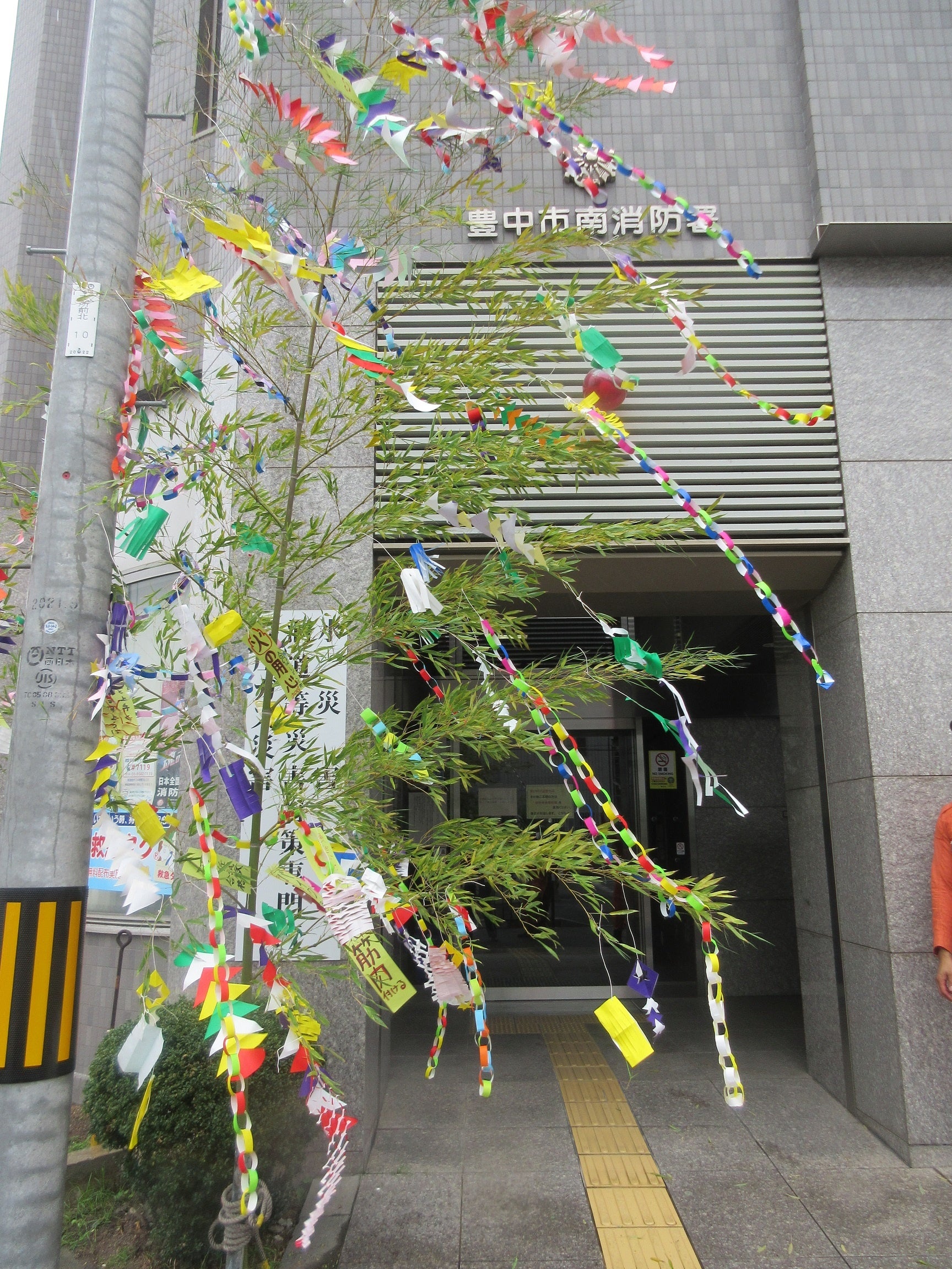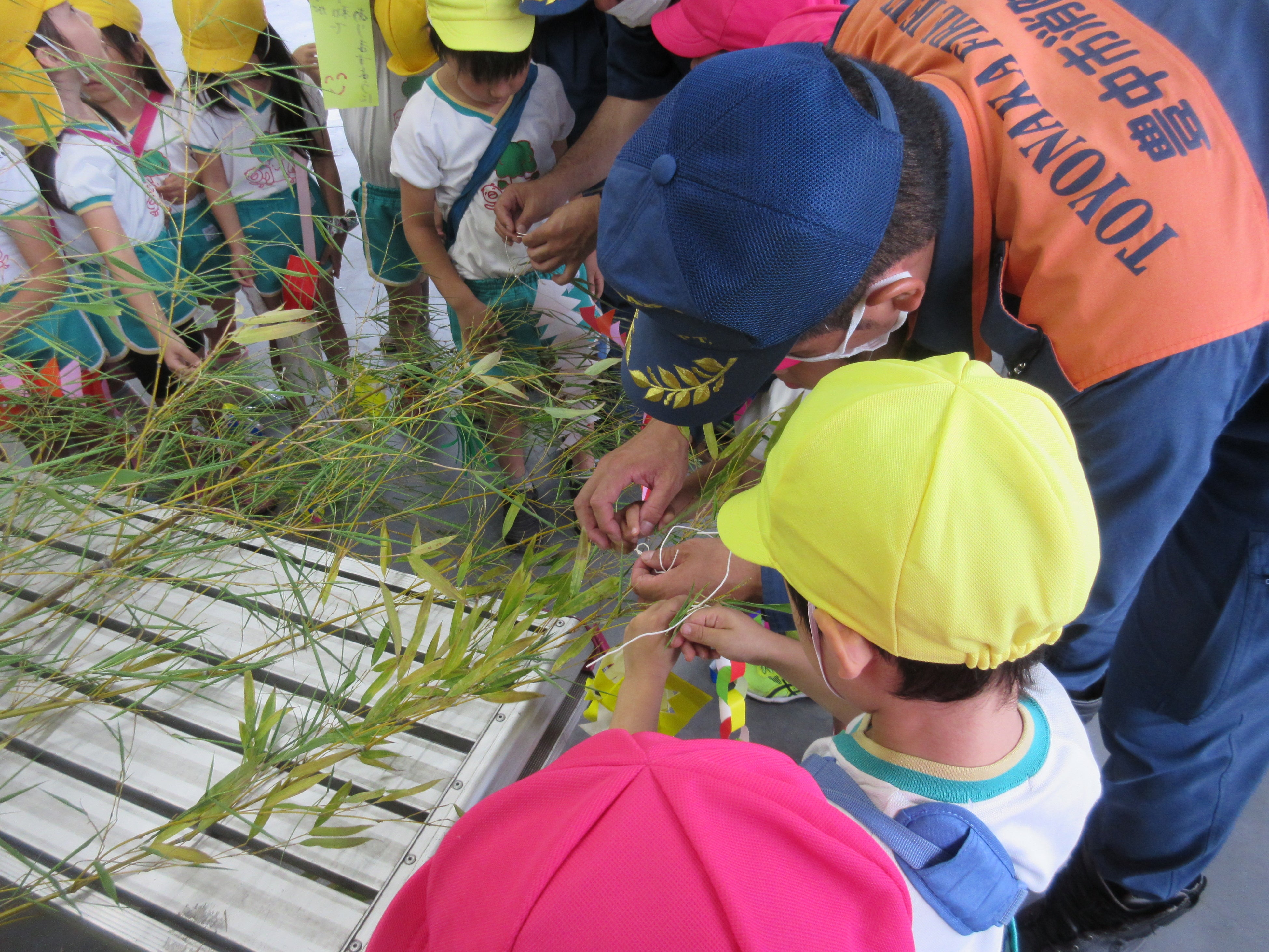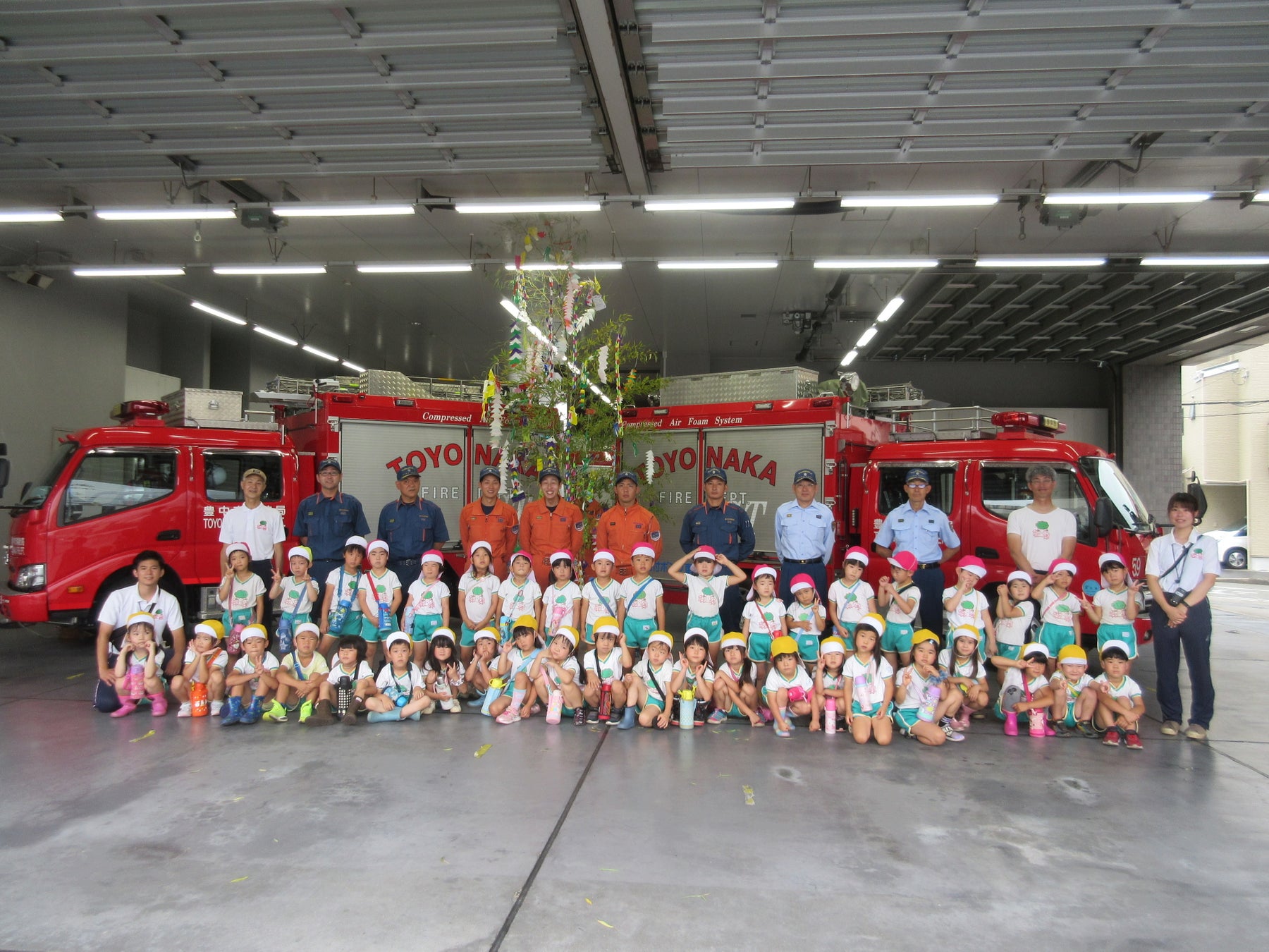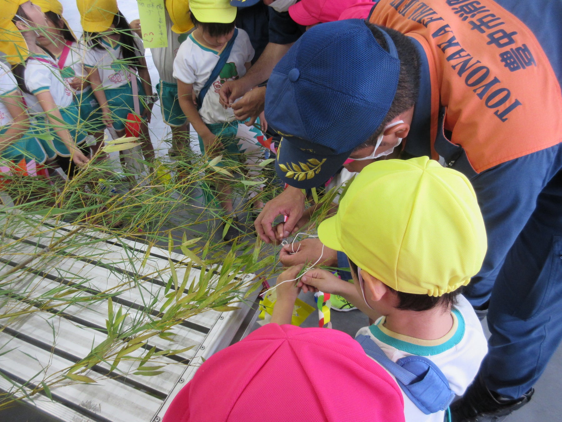 豊中市南消防署は、管内の認定こども園と共にジャンボ七夕飾りを作り、消防署の前に展示しました。