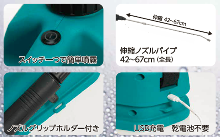 ② 電動の噴霧器は、電池式が主流ですが、本製品はUSBで簡単に充電ができるので、経済的です