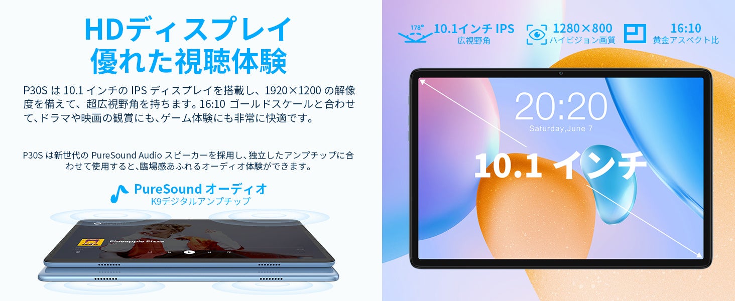 P30Sは、新世代の金属製ボディを採用し、滑らかなエッジで握り心地がいいデザインにしました。堅牢で安定した一体化設計で、おしゃれなインディゴ色仕上げで個性を主張します。10.1インチのIPSディスプレイを搭載し、1920×1200の解像度を備えて、超広視野角を持ちます。16:10ゴールドスケールと合わせて、ドラマや映画の観賞にも、ゲーム体験にも非常に快適です。ブルーライトカットモード、読書モードなどと一緒に使用することで、長時間使用しても疲れません。