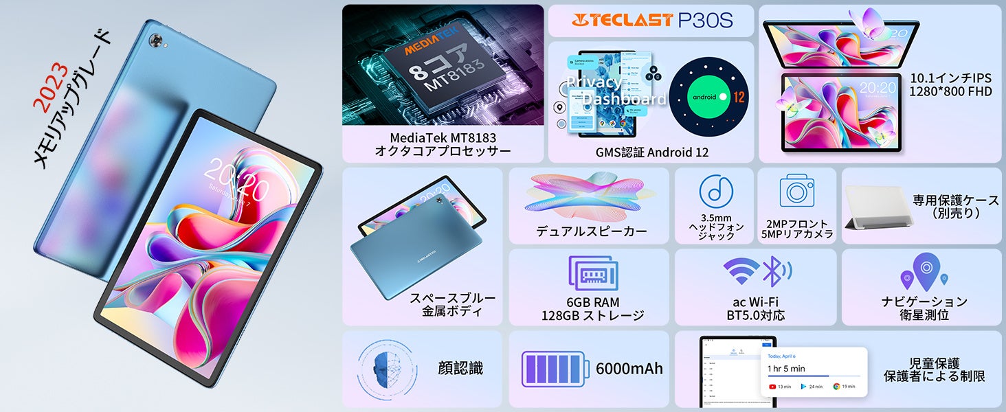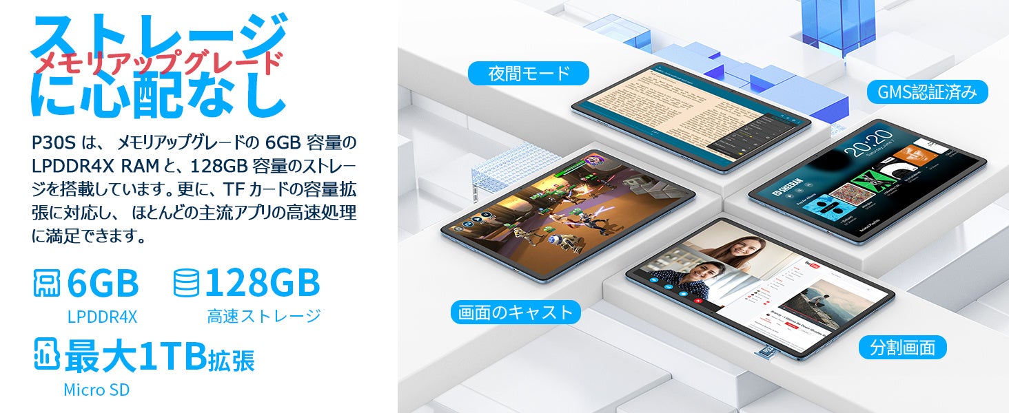 Teclastニューバージョンのタブレット「P30S」アップグレードしました。メモリーとストレージは以前の4GB+64GB から 6GB+128GB になっています。より多い、より豊富な写真や映画を保存できると思います。また、この度も30%オフの大額クーポンを準備して、是非お見逃しないよ~
