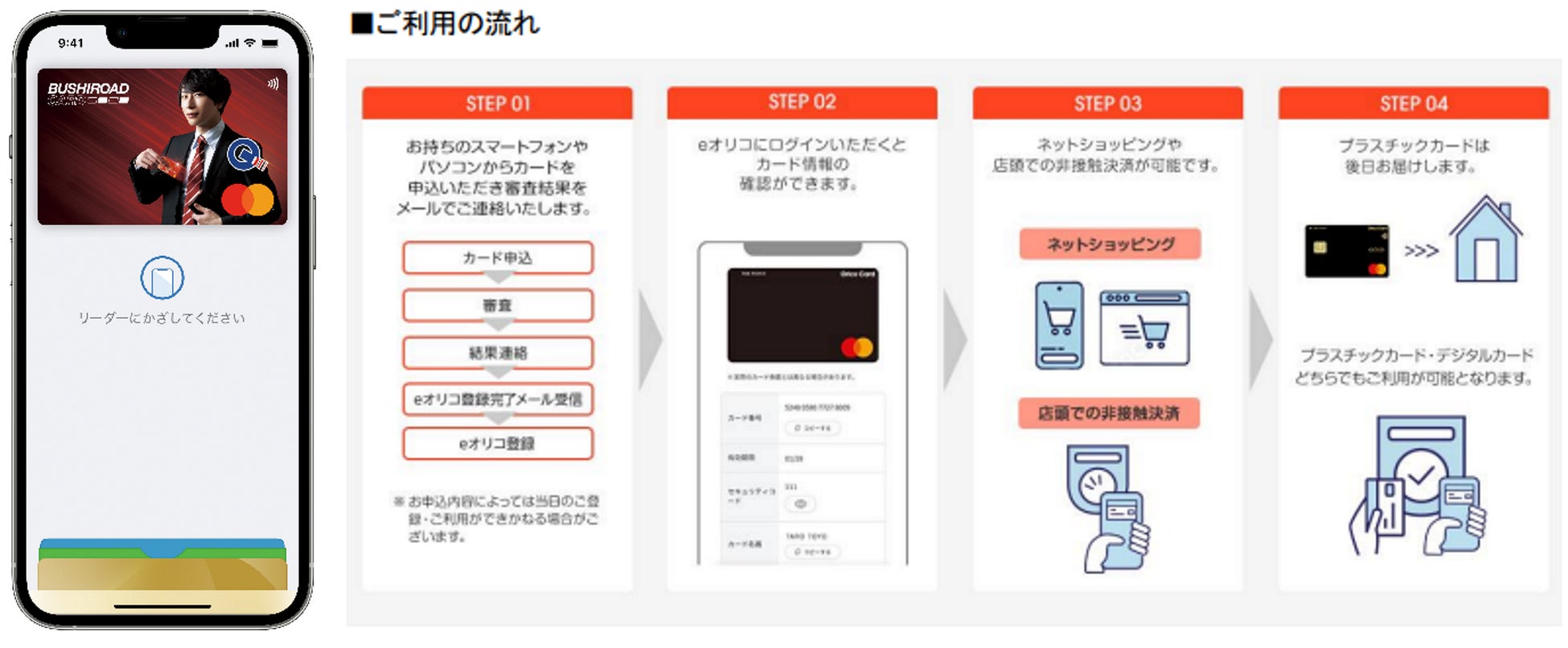 また、オリコが2024年3月より開始した「デジタルカード」スキームを用いることで、お申し込みから最短90秒で審査が完了し、その後オリコ会員向けWebサービス「eオリコ」に登録いただくと、EC などのオンライン決済にカード支払いが可能となるほか、店頭などでの非接触決済(Apple Pay)も即時にご利用がいただけます*2。
