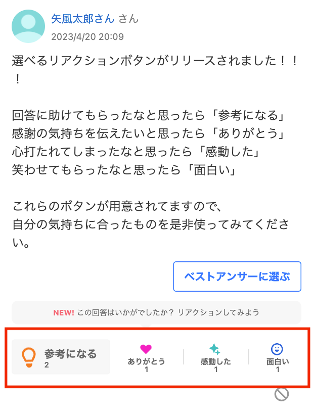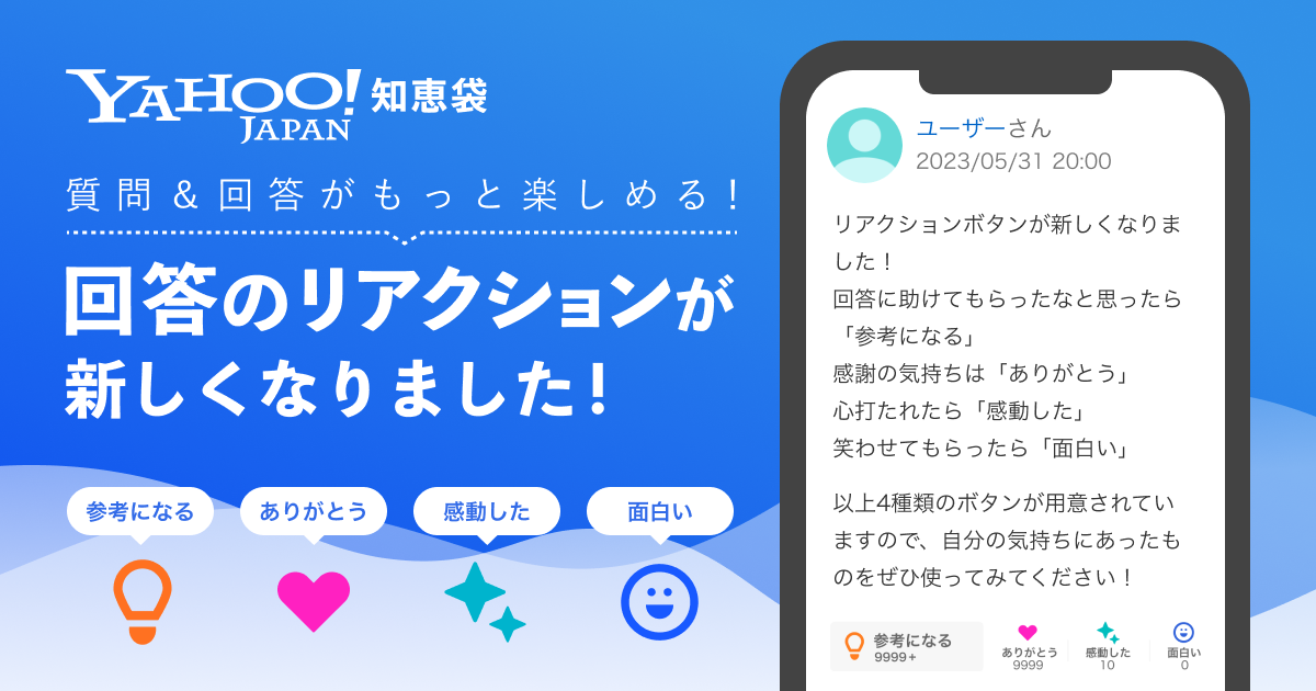 Yahoo!知恵袋、役に立った回答に対して、4種類のボタンで感謝などを示すことができる「選べるリアクションボタン」を提供開始