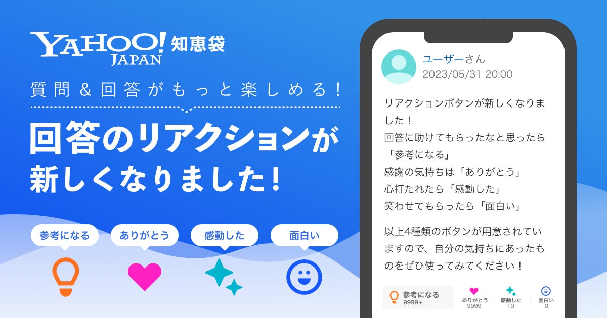 ヤフー株式会社(以下、Yahoo! JAPAN)が運営する国内最大級の知恵共有サービス「Yahoo!知恵袋」は、質問への回答に対して「参考になる」「ありがとう」「感動した」「面白い」という4種類のボタンにより感謝などを表現できる「選べるリアクションボタン」(以下、本機能)の提供を開始しました。