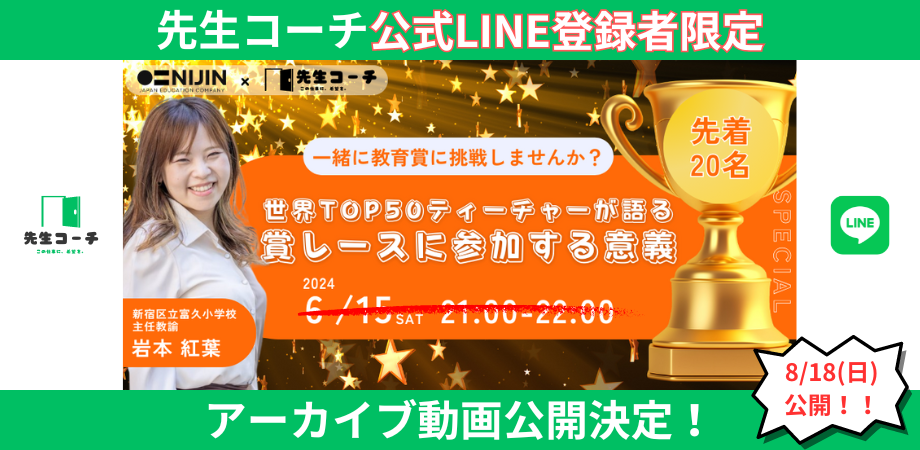 6月15日に開催されたイベント、『世界TOP50ティーチャーが語る賞レースに参加する意義』のアーカイブ動画を、先生コーチ公式LINE登録者の皆様に限定公開いたします。