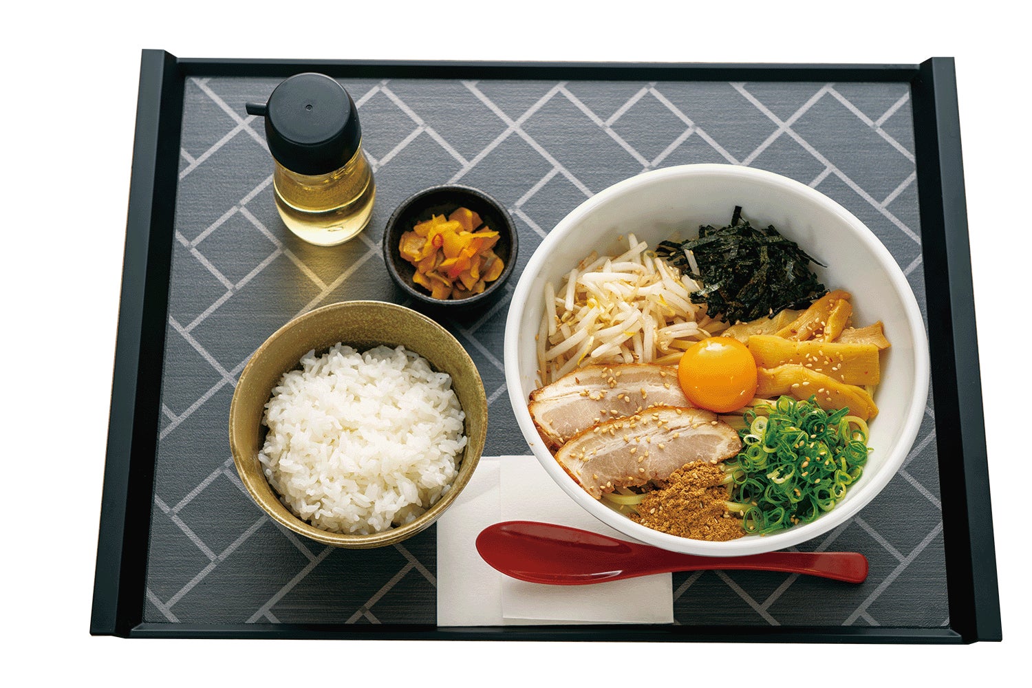 煮干しの風味を効かせた上に豚肉やしいたけの旨味も凝縮させた、濃厚な醤油ダレで仕上げました。食べ応えのある中太麺に具材を混ぜ合わせていただくと、魚介香る醬油ダレに絡み合い濃厚な旨味をお楽しみいただけます。残ったスープにご飯を加え、最後の一滴までお楽しみください。