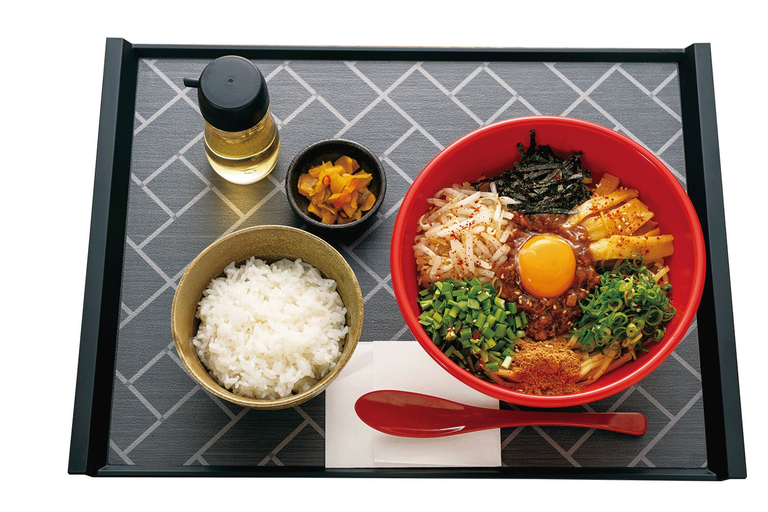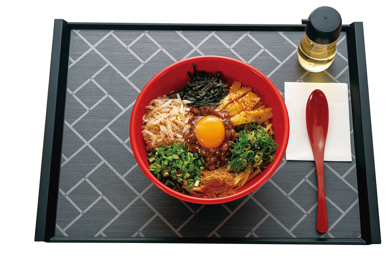 唐辛子とコチュジャンの辛味に鰹節・昆布の旨味を加え、はちみつでコクを出した辛さの中にも旨味を感じる辛旨ダレで仕上げました。食べ応えのある中太麺に具材を混ぜ合わせていただくと、甘辛いタレに絡み合い後引く辛さがクセになります。残ったスープにご飯を加え、最後の一滴までお楽しみください。