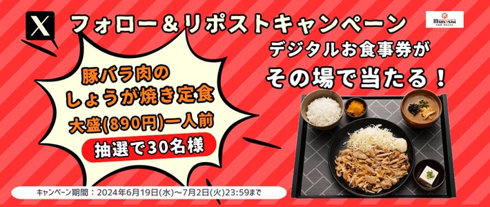あわせて、2024年6月19日(水)~2024年7月2日(火)の期間に「宮本むなし公式Xフォロー&リポストキャンペーン」を実施いたします。宮本むなしの公式Xアカウントをフォローし、キャンペーン投稿をリポストすることで応募でき、その場での抽選で30名様に、定食屋宮本むなし店内で「豚バラ肉のしょうが焼き定食 大盛り(890円税込み)」1人前をお召し上がりいただけるデジタルお食事券が当たるキャンペーンです。ぜひこの機会に宮本むなし公式Xのフォロー&リポストでのご参加をお待ちしております。