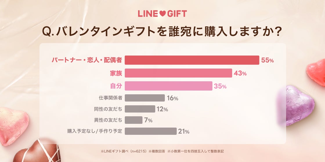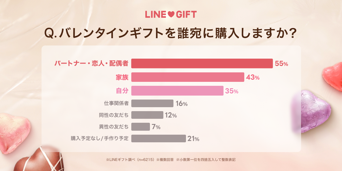 「LINEギフト」が実施したバレンタインに関するアンケートで、今年のバレンタインギフトを誰宛に購入するかを聞いたところ、「パートナー・恋人・配偶者」の55%に次いで、「家族」が43%、「自分」が35%という回答となり、大切なパートナーや家族への愛情表現や感謝を伝えるだけでなく、近年トレンドである“自分へのご褒美需要”も高い傾向がみられました。一方で、「異性の友だち」が7%ともっとも低い回答となり、バレンタインの多様化や風習の変化により“義理チョコ”の需要が減少していることが伺えます。