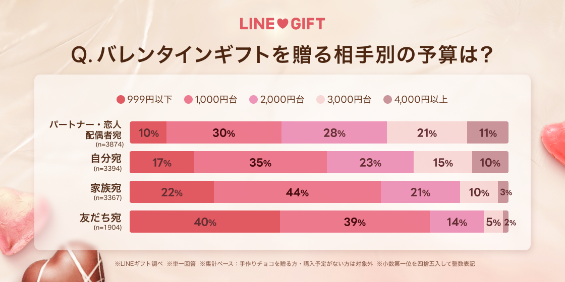 また、「バレンタインギフトを贈る相手別の予算」を聞いたところ、全体では「1,000円台」がもっとも多い結果となりました。友だち宛では「999円以下」が40%を占める一方で、パートナーや自分宛は「2,000円以上」がどちらも約半数、そのうち「4,000円以上」は10%を超えるなど、友だちや家族宛と比べて予算が高い傾向が現れました。