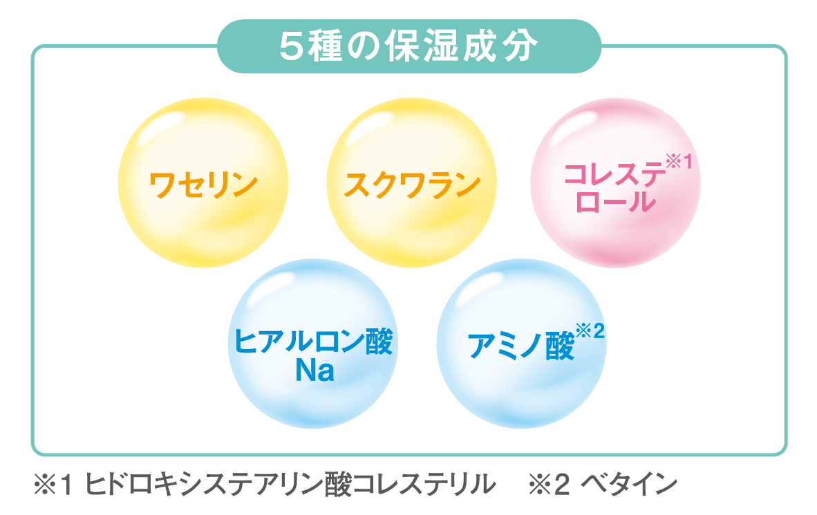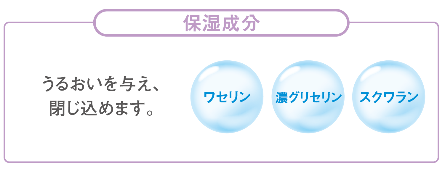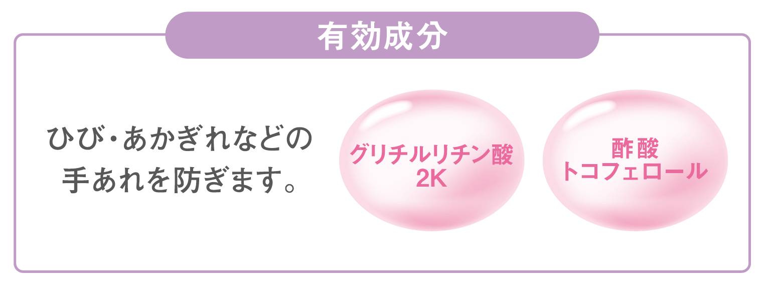 うるおいを与えて閉じ込めます。水に強く、敏感な手肌をまもります。特長② 有効成分&保湿成分配合