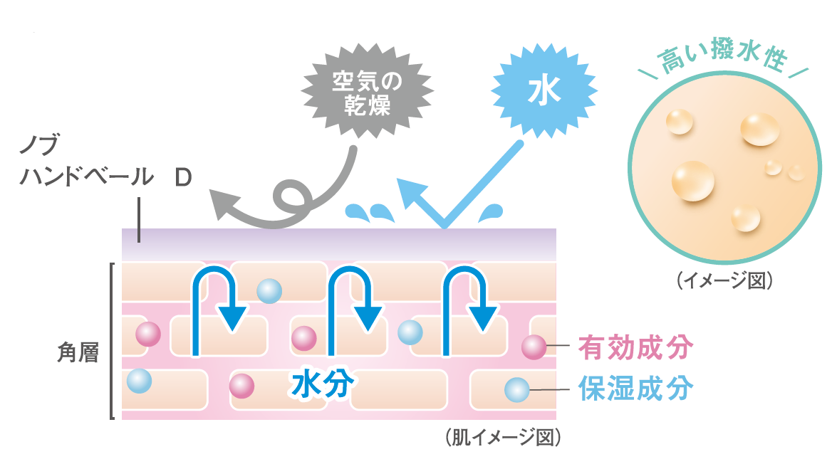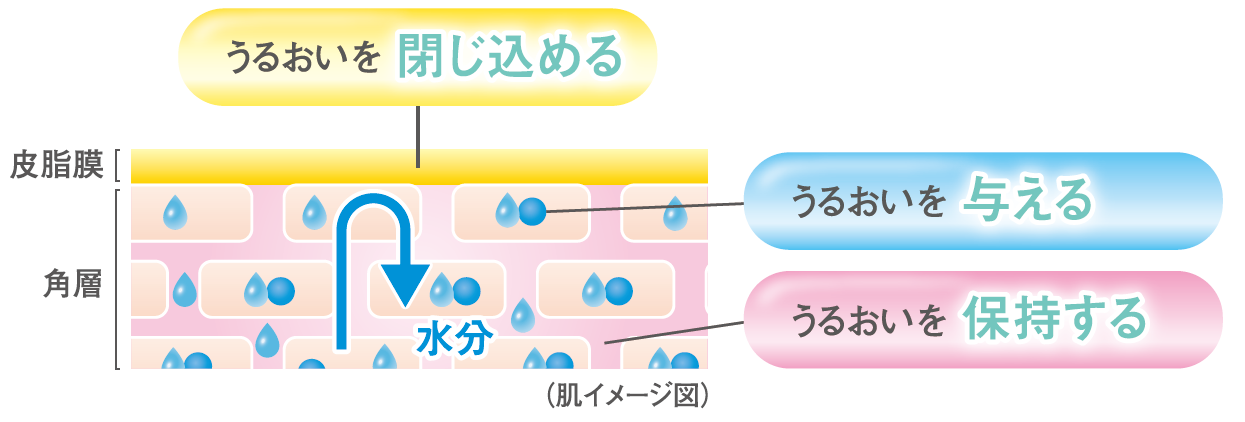 お肌にうるおいを与えるだけでなく、うるおいを閉じこめて保つことが大切です。 ノブ スキンミルク Dにはうるおいを「与える」「保持する」「閉じ込める」ための保湿成分がバランスよく配合されています。