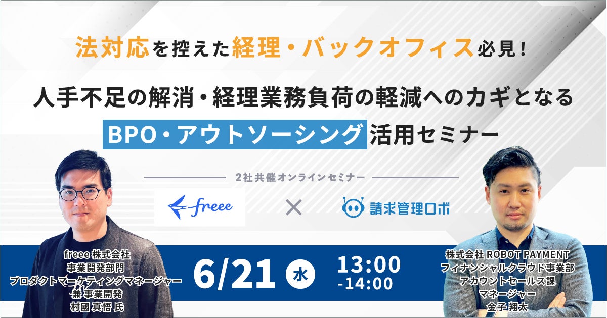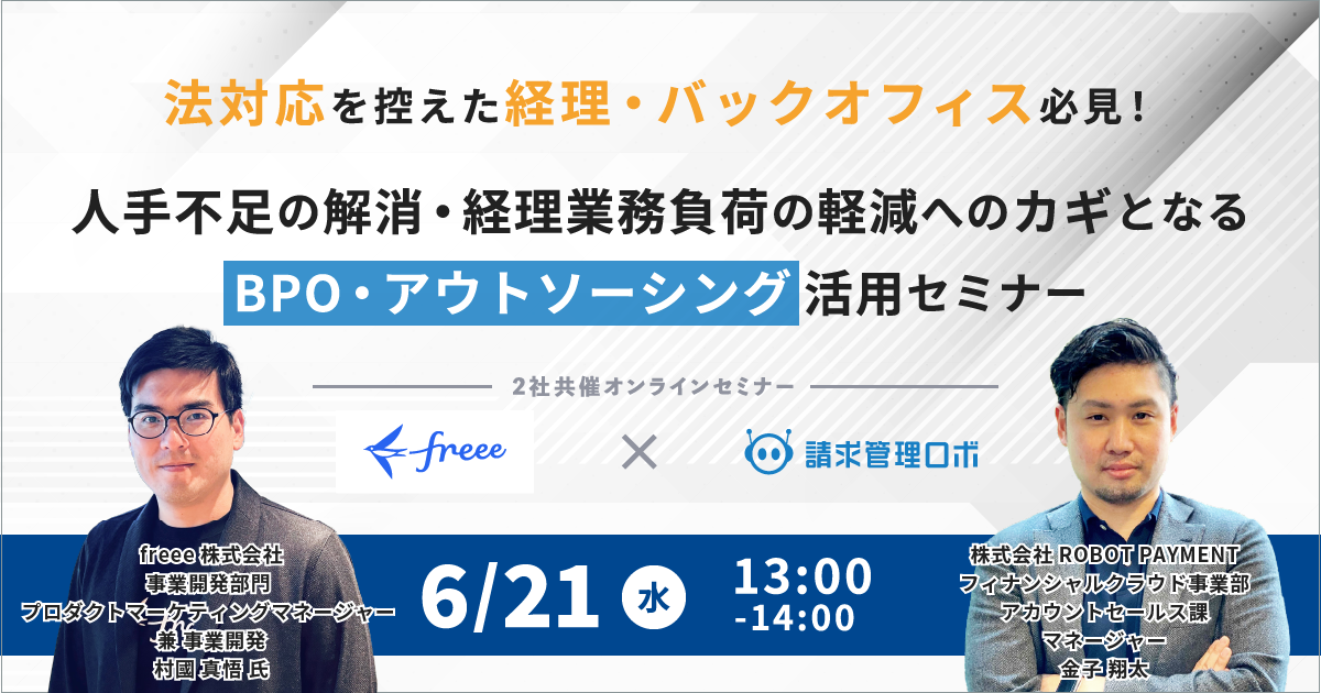 今回は、freee株式会社 村國氏をお招きし、ROBOT PAYMENT 金子とともに【請求業務に特化したBPO】を提供する二社より、企業がBPOサービス導入を検討する上で必要な「知りたい」「知っておきたい」情報を提供することで、効率的な業務の実現やリスク回避に繋がる事例やノウハウをご紹介いたします。