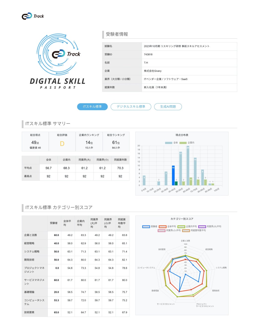 「デジタルスキルパスポート」は急速に浸透する生成AI領域にも対応しており、生成AIの概論や、実務で活用するうえで必要なモラル、プロンプトエンジニアリングなどの実践的な問題が含まれております。生成AI領域だけを抽出してスコアやレポートを確認することができ、受験者の生成AIスキルを可視化することが可能です。