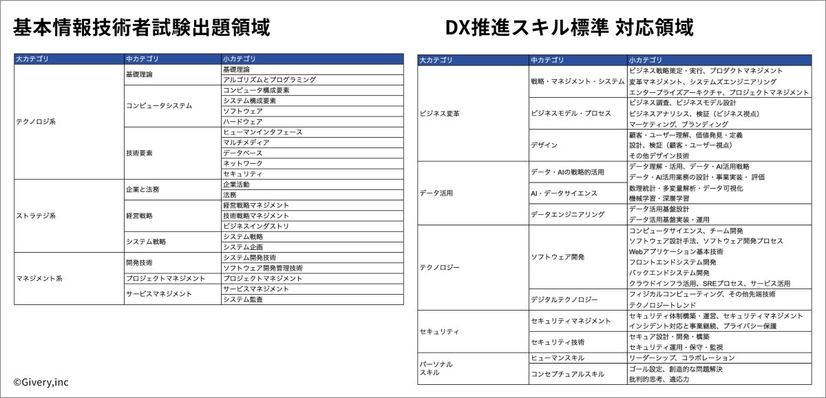 Lv.2では、知識問題だけではなく、実務問題(アルゴリズム問題、ソフトウェア開発問題、データサイエンス問題)が含まれており、基本情報技術者試験の領域をより網羅的に測る基本情報試験と、DX推進スキル標準(DSS-P)をより深く満たす試験、2つの領域を網羅しながらより高度な実装力を測る試験、の3種類からお選びいただくことができます。