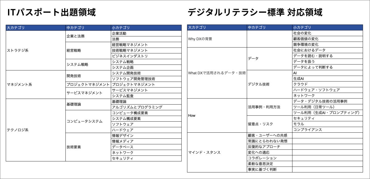 「デジタルスキルパスポート」は、経済産業省が策定した「デジタルスキル標準」に基づいた試験内容を提供します。この標準は、経営層を含むすべてのビジネスパーソンがDXに関連する基礎的な知識、スキル、マインドを習得するための指針として位置づけられているものです。