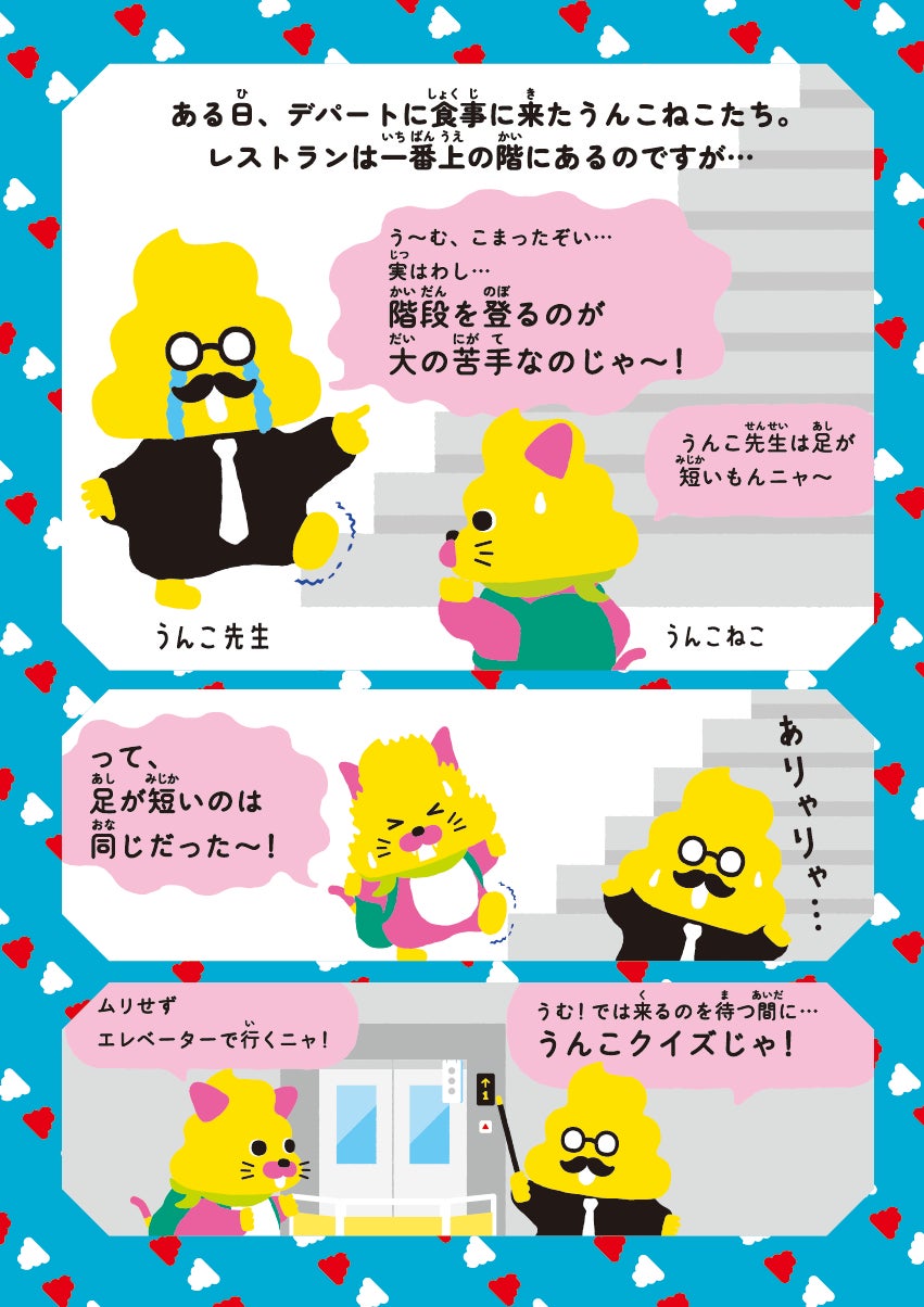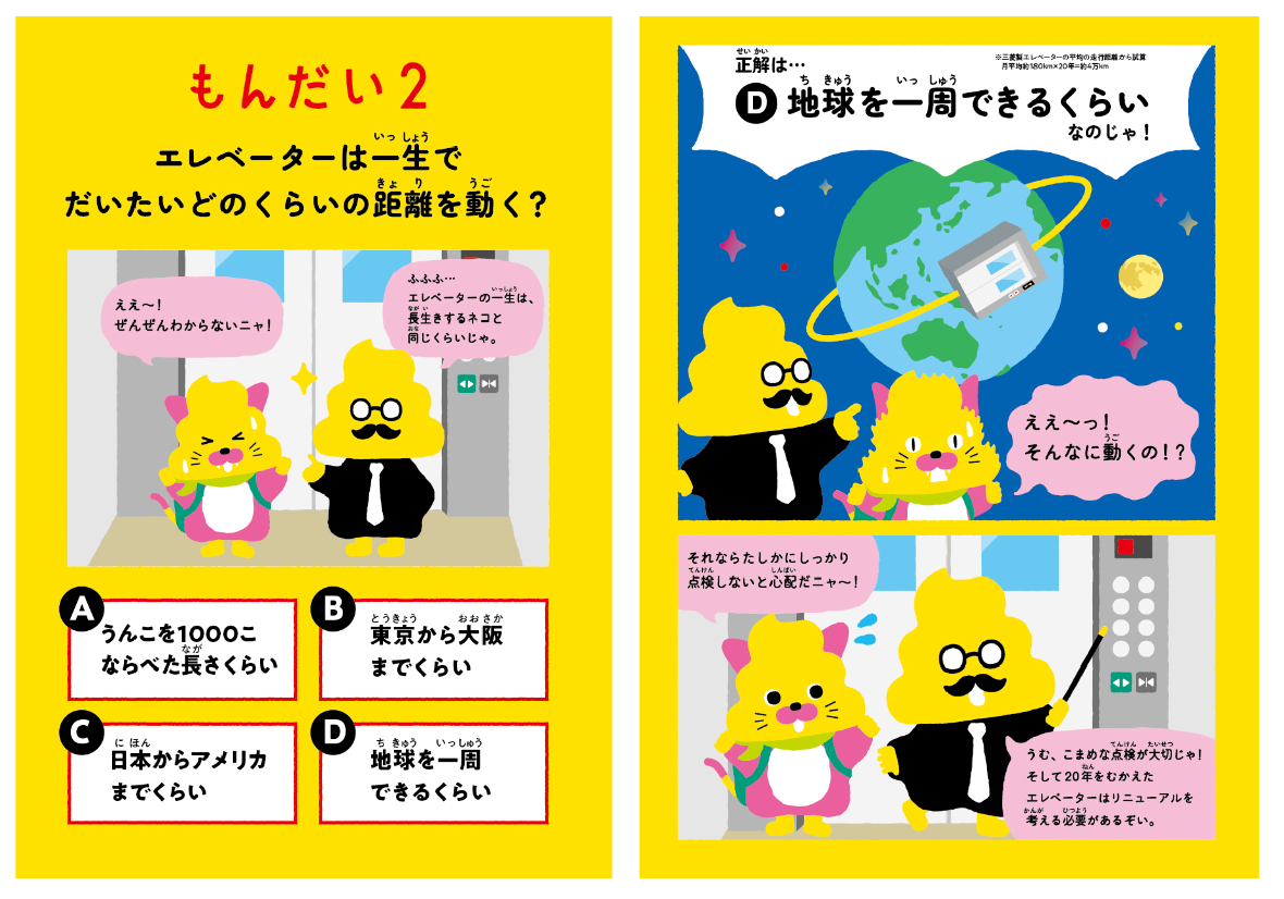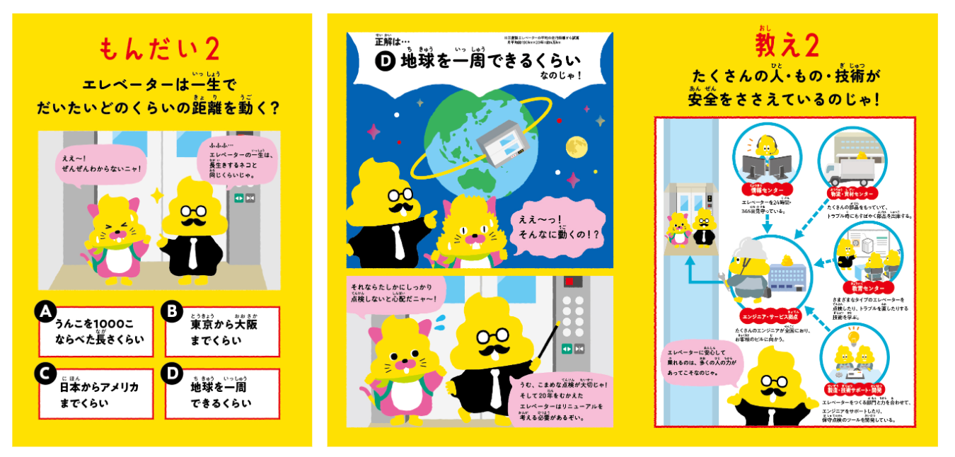 冊子の内容はクイズ形式で全3問。おなじみのうんこ先生とうんこねこがデパートの最上階のレストランへ行くためにエレベーターに乗り込もうとする場面からはじまります。