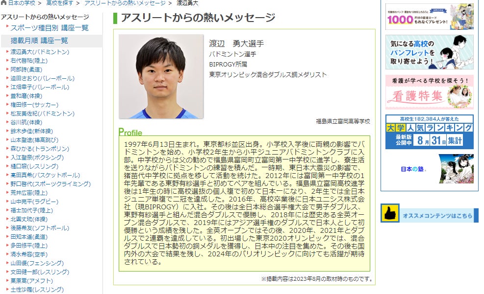 全国の大学・短大・専門学校などの学校情報を提供する、株式会社JSコーポレーション「⽇本の学校」では、注目のプロアスリート選⼿の学⽣時代の取り組みや、練習⽅法・⼼構えに関するアドバイスの他、⾼校⽣に向けた熱い応援メッセージを掲載しています。