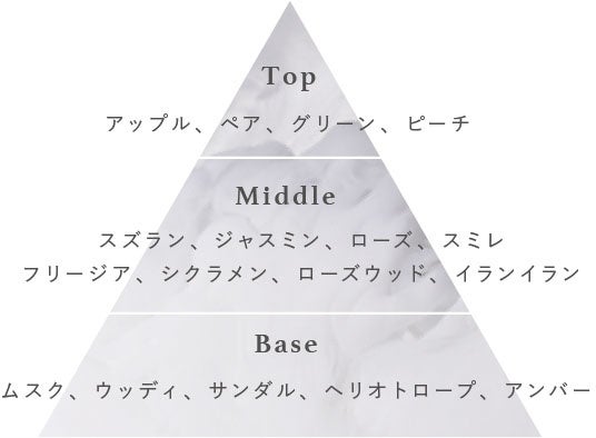 トップノート〜ミドルノートへの香りの移り変わりは、既存のホワイトムスクから大きく変えず、爽やかな甘さが通り抜けます。
