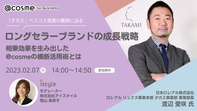 株式会社アイスタイル(代表取締役社長 遠藤 宗)は、2023年2月7日(火)に、ウェビナーイベント『ロングセラーブランドの成長戦略 ~相乗効果を生み出した @cosmeの横断活用術とは~』を開催することをお知らせいたします。