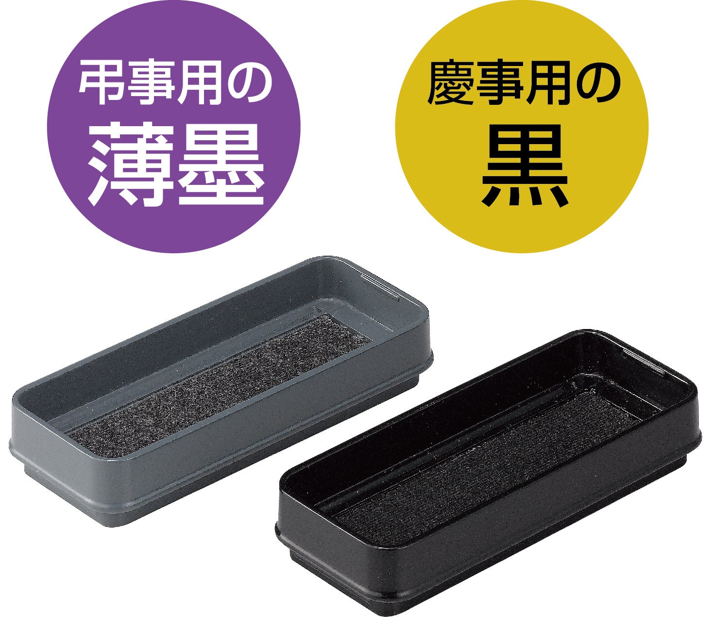 慶事用の黒と弔事用の薄墨の2色のスタンプパッドがセットになっています。にじみの少ない油性顔料インキを使用しており、印影の乾燥後は、耐水性、耐光性に優れています。