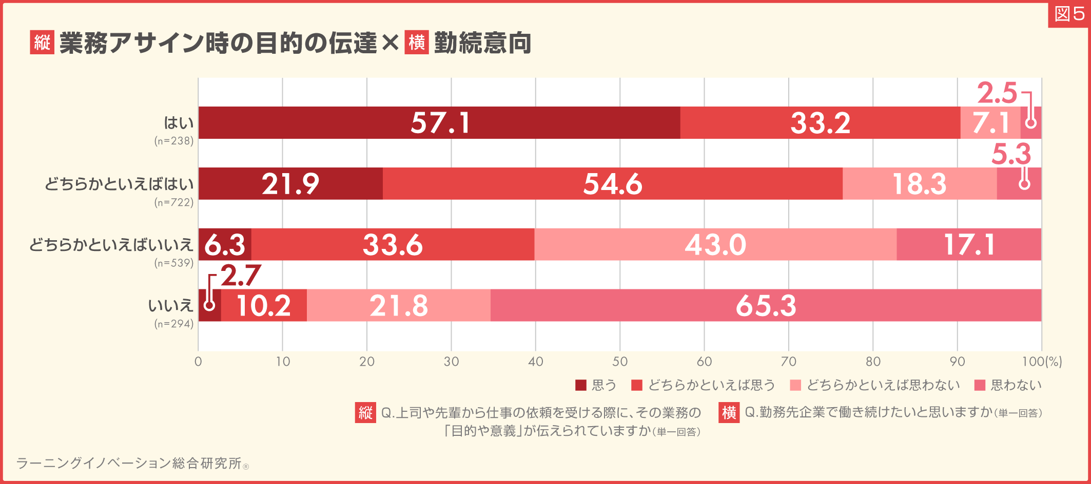 業務アサイン時の目的の伝達を「どちらかといえばはい」「どちらかといえばいいえ」の結果を鑑みると、業務付与時の目的・意義の伝達と、若手社員の勤続意向には、相関の関係があることがわかりました(図5)。