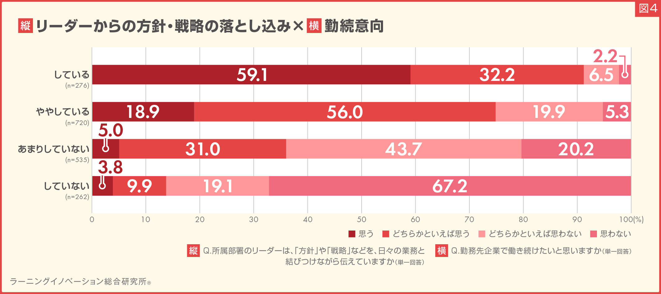 リーダーから方針・戦略の落とし込みがある若手社員、「働き続けたいと思う」と9割以上が回答(図4)