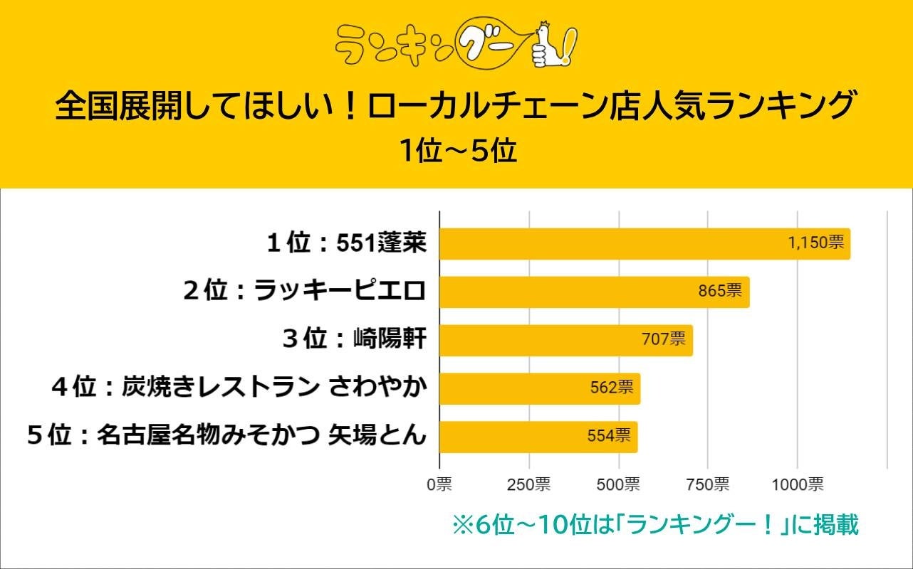 ランキングー!では各地方のローカルチェーン店をピックアップし、投票者が「近くにあったらいいのに」または「もっと広まってほしい」と感じる店を調査。全年代の男女(性別回答しないを含む)10,809名にアンケートを行いTOP10を決定しました。ここではTOP5をご紹介します。