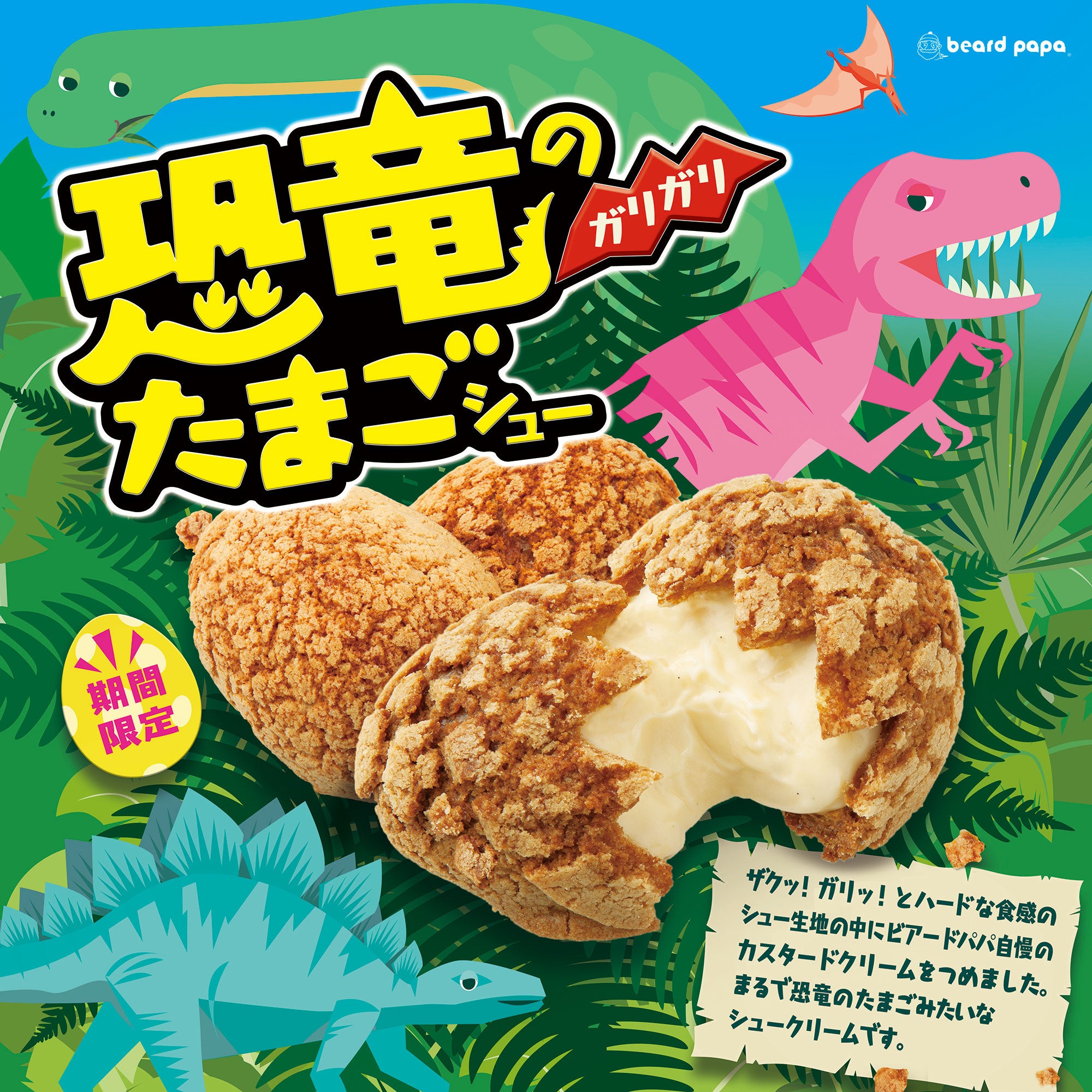 ザクッ!ガリッ!とハードな食感のシュー生地の中にビアードパパ自慢のカスタードクリームをつめました。まるで恐竜のたまごみたいなシュークリームです。