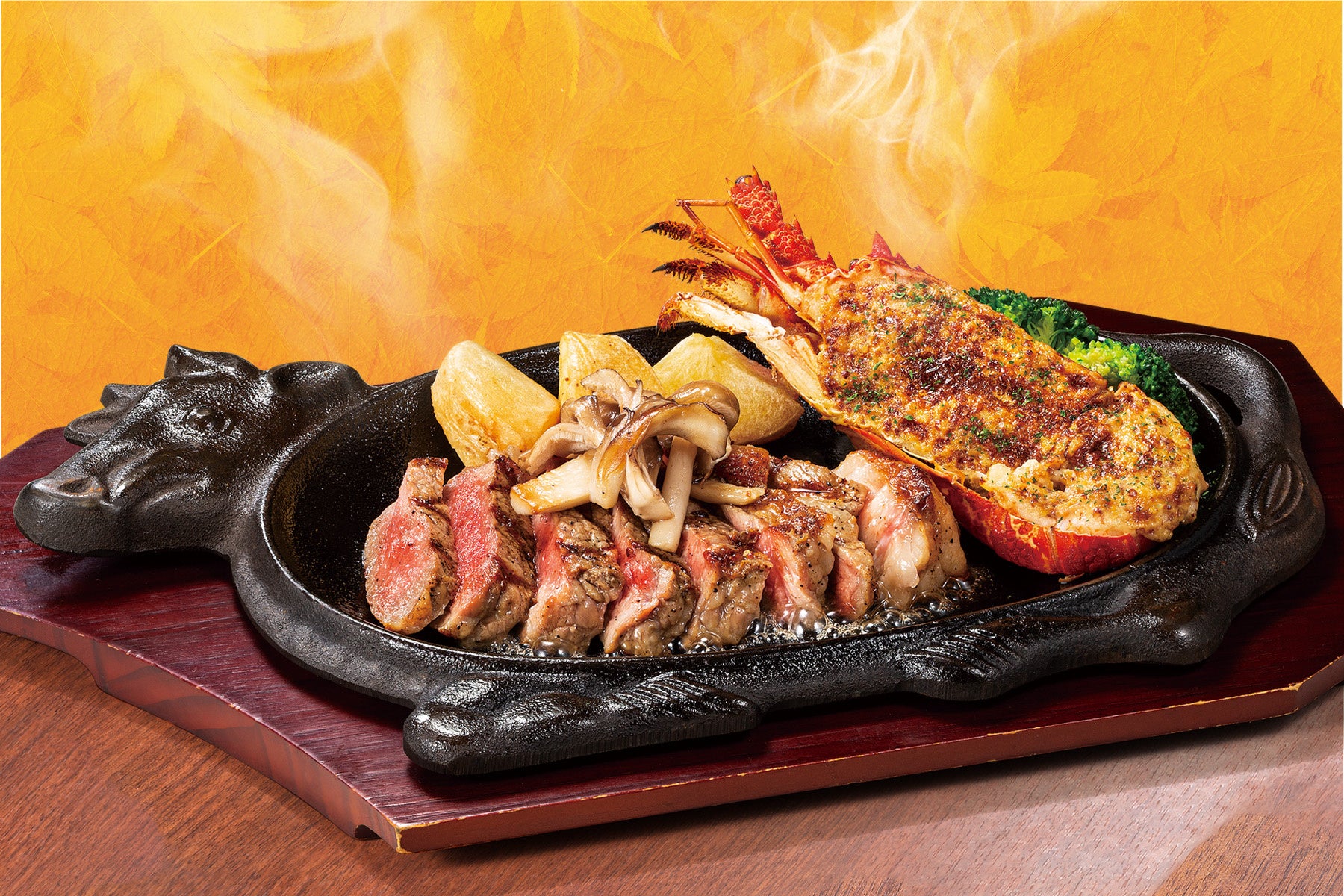 大阪府・兵庫県・京都府・福岡県の店舗で数量限定販売のコンボメニューです。ロブスターはマスタードとマヨネーズの特製ソースで黄金色に焼き上げており、サーロインステーキと組み合わせることによって、見た目もより豪華な一品に仕上げました。