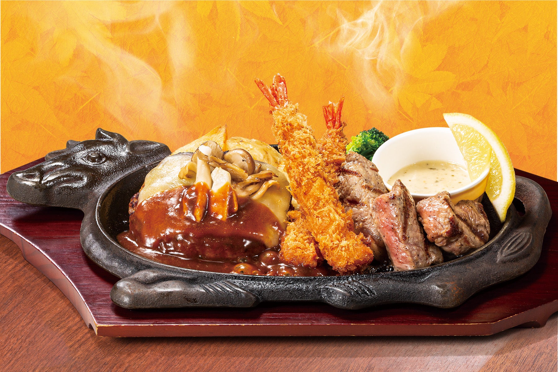 「秋の大満足コンボ」はダブルチーズハンバーグとカットサーロインステーキ90gにエビフライを組み合わせて1枚の鉄板でご提供する、欲ばり感がうれしい秋季限定のメニューです。チーズハンバーグに添えた茸ソテーとデミグラスソースの香りが食欲をそそり、大満足いただけること間違いなしの一品です。