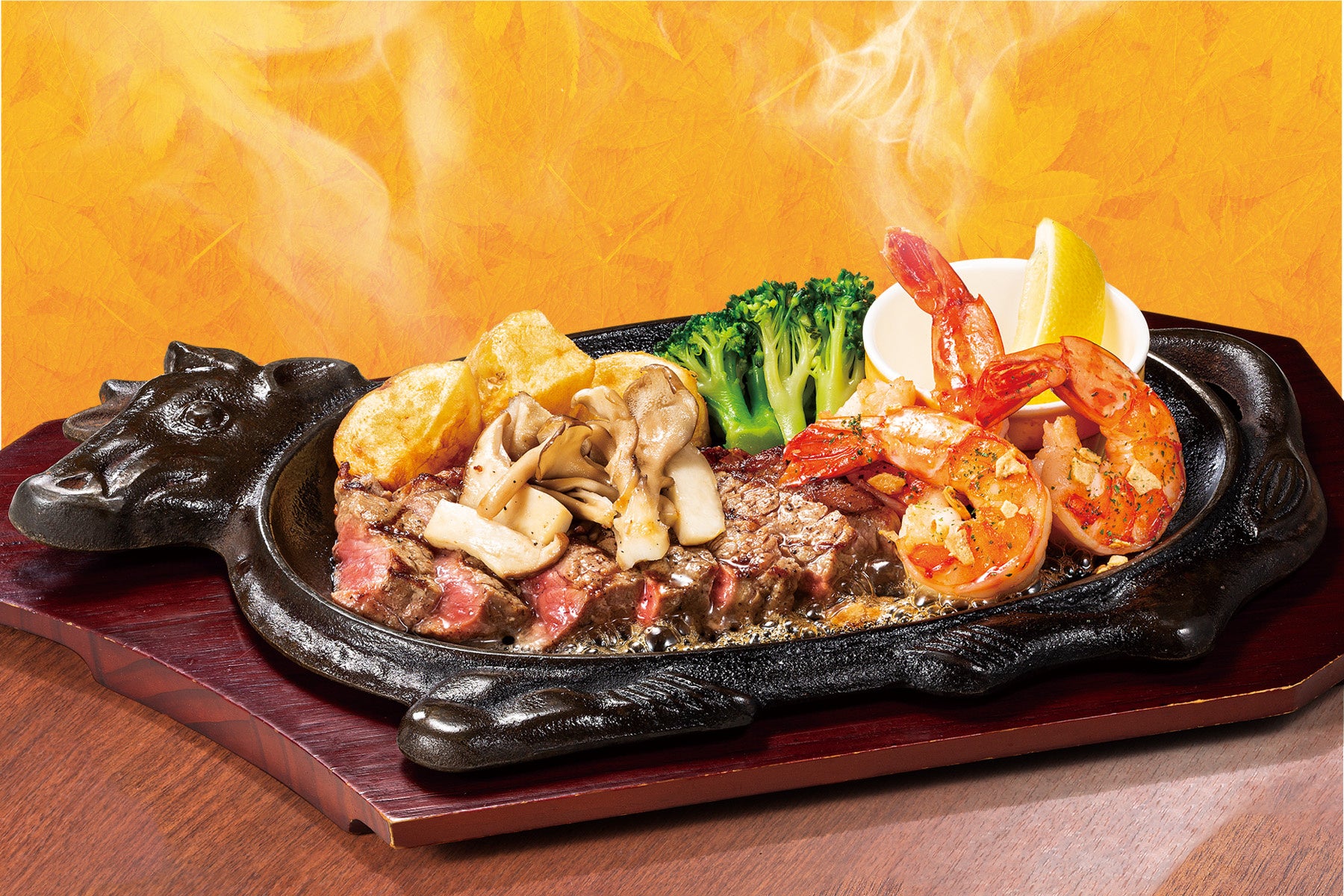 ※茸サーロインステーキ&ロブスター黄金焼きは大阪府・兵庫県・京都府・福岡県の店舗で数量限定販売いたします。無くなり次第、茸サーロインステーキ150g&ブラックタイガーグリルを販売いたします。