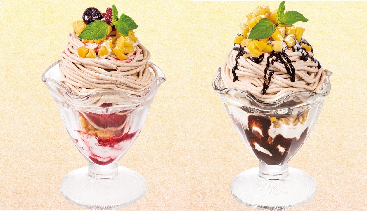 写真左:モンブランベリーパフェ 写真右:ショコラモンブランパフェ 各480円(税込528円)