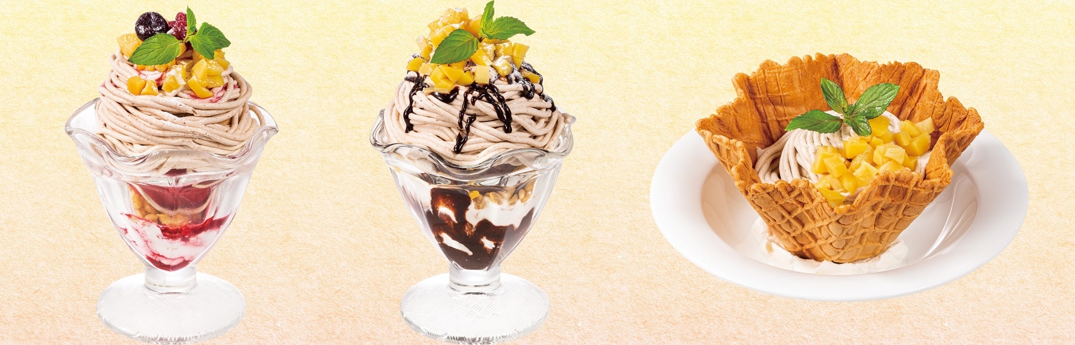 渋皮栗アイスやカットマロン、マロンホイップなど秋を感じさせる食材を使ったモンブランデザートを3種類ご用意しました。マロン尽くしのパフェにフランボワーズアイスの果実味を合わせた「モンブランベリーパフェ」、チョコレートと濃厚なマロンが絶妙にマッチした「ショコラモンブランパフェ」。さらに、お口直しにピッタリなサイズの「モンブランプチアイス」は、渋皮栗アイスとたっぷりのマロンホイップを合わせた、栗の濃厚さを堪能できるデザートです。