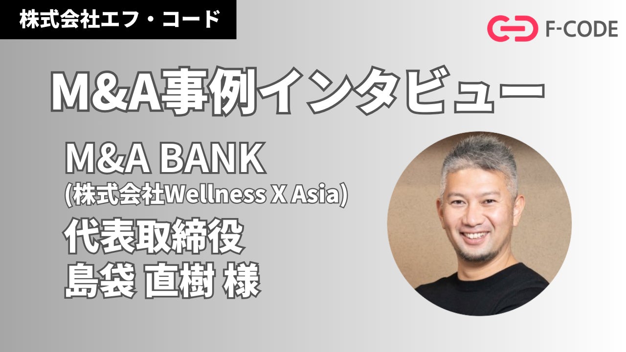 株式会社エフ・コード(本社:東京都新宿区、代表取締役社長:工藤 勉、証券コード:9211、以下「当社」)は、このたび株式会社Wellness X Asia(本社:東京都渋谷区、代表取締役社長:島袋直樹、以下M&A BANK)に、当社とのM&Aの取り組みについてインタビューを行ったことをお知らせします。