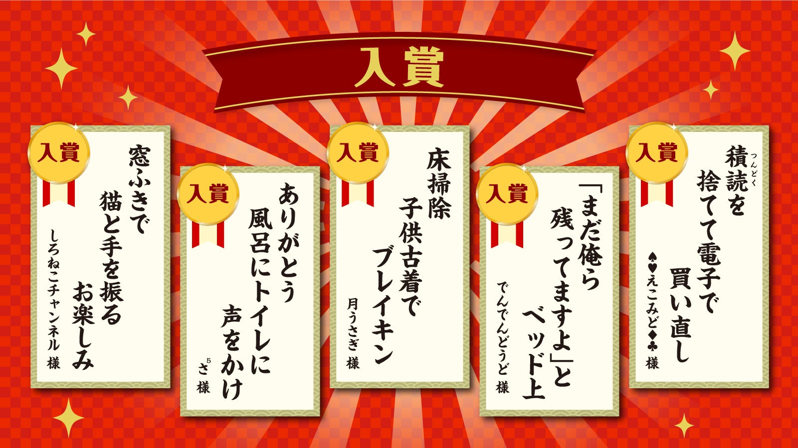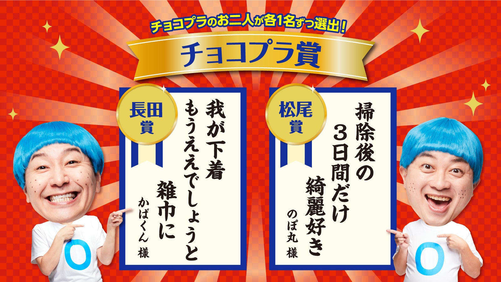 また、今年は「チョコプラ賞」としてチョコレートプラネットの長田さん、松尾さんにそれぞれ1作品ずつ選出いただきました。今年の流行語にノミネートされた人気ドラマの名セリフ「もうええでしょう」を使った一句や、大掃除後のあるあるを描いた一句がそれぞれ長田賞・松尾賞に輝きました。