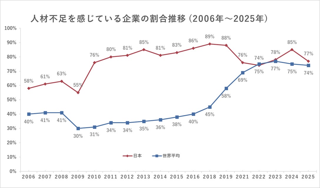【2025年 人材不足調査の結果/日本・世界平均】人材の確保が困難であると感じていますか:世界平均75%→74%、日本85%→77%