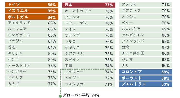 42カ国・地域の中で人手不足感が最も高いのは、ドイツ(前年比+4ポイント、86%)、イスラエル(前年比+3ポイント、85%)、ポルトガル(前年比+3ポイント、84%)の順でした。日本も世界平均(74%)を上回る77%と高い水準にあり、人材確保が課題となっています。(図2参照)