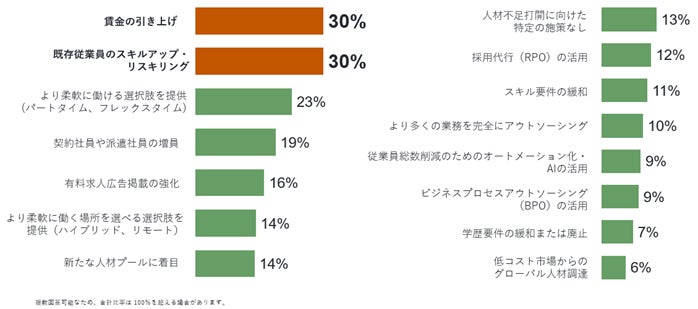 【日本の調査結果】長引く人手不足を打開するために、雇用主が講じる施策:「賃金の引上げ(30%)」など