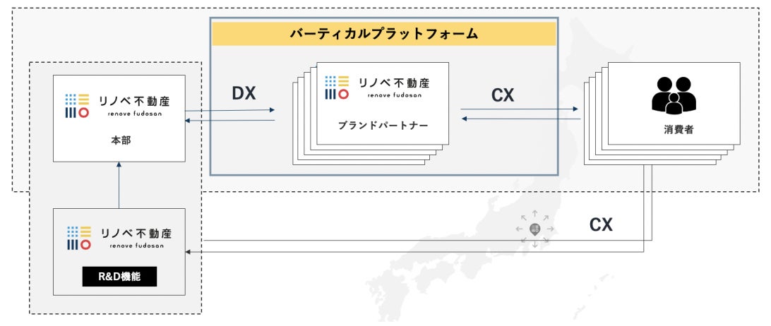 顧客は負担のかからないシームレスな体験を通し、百人百色の「自分らしい」暮らしを実現することができます。本部では、WEBメディア「リノベ不動産ドットコム」や、業界特化型CRM・MAツール、動画教育コンテンツ、業務プロセスを効率化する統合基幹情報システム「リノベ不動産cloud」などの開発を行い、全国のブランドパートナー企業へSaaS提供をしています。